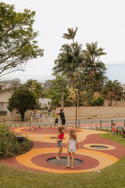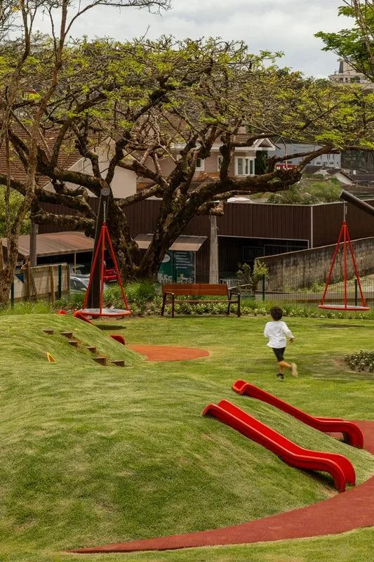 Com um amplo playground equipado com piso anti-impacto e antiderrapante, a Praça Cidade das Águas garante diversão segura para as crianças. Já para quem busca tranquilidade, há uma área de contemplação com gramado, árvores e cadeiras para relaxamento. O ambiente é complementado por calçadas no mesmo nível da rua e iluminação planejada, que aumentam a acessibilidade e o conforto.
